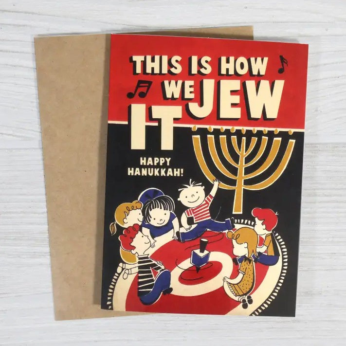 We know you're singing it Montell Jordan style! Celebrate Hanukkah with a smile with this cute vintage-inspired card, "This Is How We Jew It"! Featuring a lovely illustration that reflect the warmth and happiness of the holiday, this card brings a cheerful and heartfelt touch to your greetings. It’s perfect for friends and family who appreciate a good pun and a little light-hearted humor.